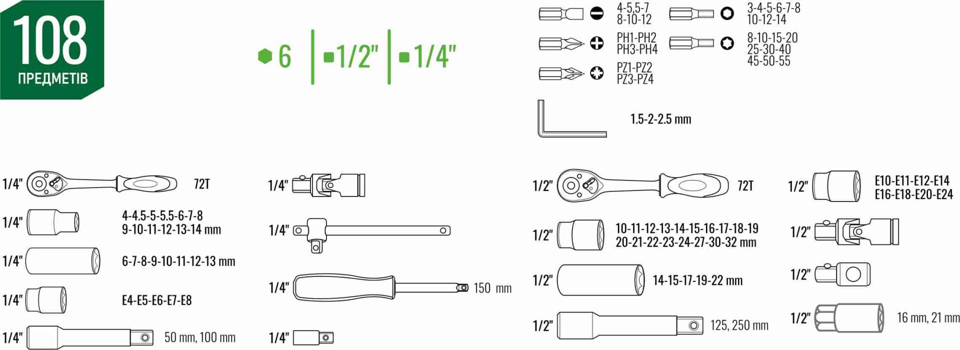 Hабір інструменту Alloid 1/2" і 1/4" 6-г 108 предметів (NI-1108 WN-6)